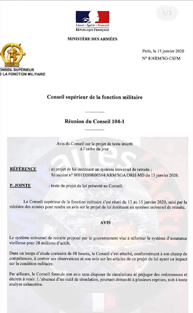 Seul le prononcé fait foi « Et vous savez aussi l'attention constante que je porte à la prise en compte des exigences de votre métier dans la création d'un système universel de retraites. Je me suis exprimé, je crois avec clarté, en décembre dernier en Côte d'Ivoire. Je sais que la ministre, laquelle a veillé avec détermination et courage à défendre les quelques mots que j'avais prononcés et les spécificités que j'évoquais, la ministre disais-je, a, depuis lundi, saisi le CSFM sur le projet de loi. Il a rendu son avis et j'en tiendrai le plus grand compte. Je connais la sensibilité sur le sujet et je la comprends parce que les pensions militaires constituent une garantie essentielle du contrat que l'Etat et la Nation passent avec ceux qui acceptent de les servir par le métier des armes. Elles constituent une contrepartie que la Nation apporte solidairement à votre engagement exorbitant à la défendre. Elles sont également une garantie du modèle d'armée dont la France a besoin pour assurer sa défense et ses missions dans le monde : une armée jeune, agile, disponible sans contrepartie, qui ne compte pas ses heures mais sert en tout temps et en tout lieu, une armée d'emploi, engagée en opérations, avec une chaîne de commandement directe qui va du chef des armées au terrain, telle que nous la connaissons aujourd'hui. Aussi, je le redis, les engagements que j'avais pris devant vous il y a un an, de prise en compte des spécificités militaires et du modèle d'armée, sont et seront tenus. J'y veillerai personnellement. ».Le projet de loi est en cours d’examen par le Conseil d’Etat qui a rendu son avis le jeudi 23 janvier 2020.